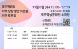 교육 김금덕 기자2024. 11.04[정보신문 = 김금덕 기자] 제주특별자치도교육청(교육감 김광수)은 오는 6일 오후 3시부터 제주학생문화원에서‘제주학생의 학력 향상 방안 마련을 위한 토론회’를 개최한다. 이번 토론회에선 가정과 학교, 교육청이 함께 아이들의 학력 향상 방안에 대한 공감대를 형성하고 교육 현황 및 교육현장에서의 다양한 문제를 짚어보고 학생들의 학력 향상을 위한 실질적인 방안을 찾을 예정이다. 성태제 전(前)한국교육과정평가원 원장의 기조 강연을 시작으로 교육의원, 교육관련 연구위원, 현직 교감, 교사, 학부모님들의 토론의 장이 펼쳐지고,...