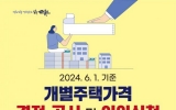 순천 김금덕 기자2024. 09.27[정보신문 = 김금덕 기자] 순천시(시장 노관규)는 올해 6월 1일 기준 개별주택가격을 9월 26일자로 결정·공시하고, 오는 10월 25일까지 이의신청을 받는다고 밝혔다. 대상은 올해 1월 1일부터 5월 31일까지 신축, 증축, 토지분할 및 합병 등 변동사항이 있는 주택 총 230호로 지난 10일 개최된 순천시 부동산가격공시위원회의 심의를 거쳐 최종 결정됐다. 개별주택가격은 순천시 누리집(https://www.suncheon.go.kr)과 부동산공시가격알리미(https://www.realtyprice.kr)를 통해 열람 ...
