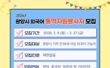 광양 남재옥 기자2026. 02.09[정보신문 = 남재옥 기자] 광양시는 각종 축제와 국제행사에서의 통역 지원과 외국인 민원 안내 등 다양한 분야에서 통역 봉사에 참여할 시민 외국어 통역자원봉사자를 2월 9일부터 2월 27일까지 모집한다고 밝혔다. 모집 대상은 공고일 기준 광양시에 거주하는 만 19세 이상 시민으로, 영어·중국어·일본어를 비롯한 기타 외국어 구사가 가능하면 누구나 신청할 수 있다. 선발된 통역자원봉사자는 매화축제 등 광양시 주요 축제와 각종 대형 행사에서 외국인 대상 현장 안내 및 통역을 지원하게 되며, 관내 기관·업체 협조 요청에 따른 ...