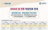 고창 남재옥 기자2026. 02.09[정보신문 = 남재옥 기자] 고창군이 설 연휴(14~18일) 군민의 건강을 지키고, 의료 이용 불편을 최소화하기 위해 비상진료체계를 가동한다. 지역응급의료기관인 고창종합병원은 응급환자 발생을 대비해 24시간 응급실을 운영한다. 보건기관 11개소, 당직 병·의원 26개소, 약국 22개소가 일자별 지정 운영할 계획이다. 연휴 14일(토요일)에는 대부분의 관내 의료기관에서 오전에 정상 진료가 이뤄진다. 고창군보건소를 비롯한 보건진료소(10개소)는 연휴 기간동안 오전 9시부터 오후 6시까지 정상 진료하며, 권역별 진료지역을 나누...