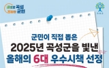 곡성 남재옥 기자2025. 12.16[정보신문 = 남재옥 기자] 곡성군(군수 조상래)은 2025년 한 해 동안 군정을 빛낸 6대 우수시책 사업을 선정했다고 16일 밝혔다. 곡성군은 각 부서에서 추진한 32개 사업을 대상으로 1차 내외부 전문가 심사로 10대 우수시책을 선정하였고, 2차 군민 선호도 조사를 거쳐 최종 올해의 6대 우수시책을 확정했다. 특히, 이번 선정에서는 군 홈페이지를 통한 온라인 설문조사와 함께 11개 읍면사무소 현장 주민투표를 병행하여 다양한 의견을 폭넓게 수렴하고, 정책 과정에 대한 군민의 공감대와 신뢰를 확대하였다. 곡성군은 ...