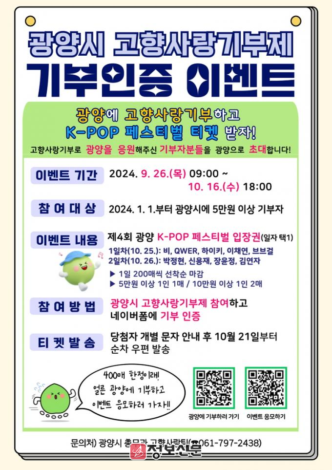 | 광양시, 고향사랑기부제 참여자 대상 이벤트 실시 광양을 응원해주신 기부자분들을 ‘광양 K-POP 페스티벌’에 초대합니다! 김금덕 기자 jbnews24@naver.com |