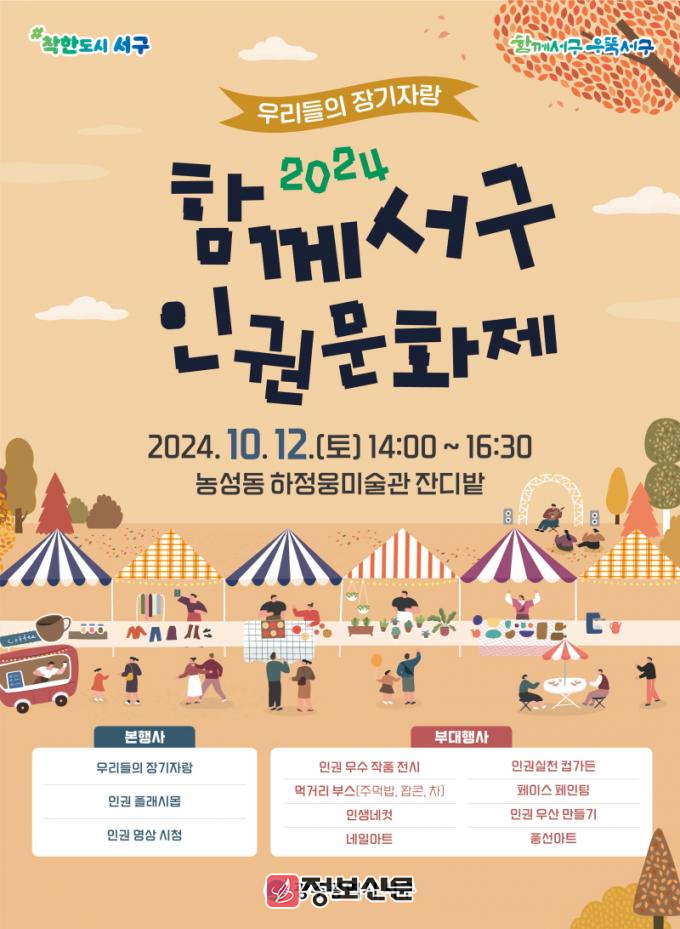 김이강 서구청장은 “이번 인권문화제는 단순한 행사를 넘어 인권이 우리 삶의 중심에 있음을 보여주는 축제의 장이 될 것이다”며 “많은 분이 참여해 인권에 대해 생각하고 즐거운 시간을 누리시길 바란다”고 말했다.