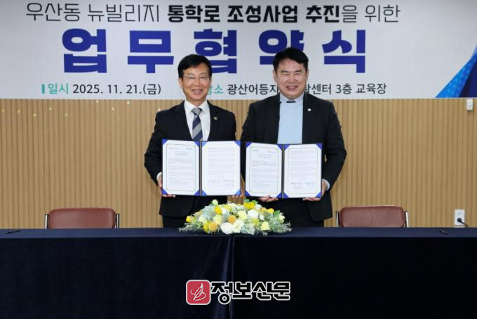 우산동 뉴빌리지 통학로 개선사업은 그동안 보도가 없거나 폭이 좁아 안전사고 위험이 높은 송우초·광산중 주변의 보행환경을 개선하는 사업이다. 이번 협약은 행정기관과 교육기관 간 상생 협력을 통해 학생들의 안전한 통학환경을 조성하기 위해 마련됐다.
