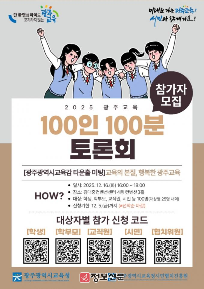 광주광역시교육청은 토론회에 앞서 오는 12월 5일까지 학생, 학부모, 교직원, 시민 등 주체별 25명씩 총 100명의 참가자를 선착순 모집한다.