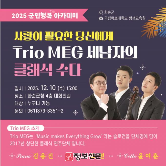 조미화 화순군 인구청년정책과장은 “2025년 한 해 동안 군민행복 아카데미에 함께해 주신 군민 여러분께 감사드린다”라며, “Trio MEG가 들려주는 따뜻한 음악과 이야기로 연말의 감동과 위로를 느끼시길 바란다”라고 말했다.