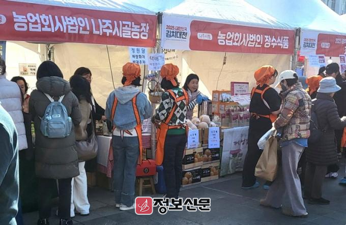 ![]() 나주시는 ‘2025 대한민국 김치대전’에 나주 농특산물 판매 부스를 설치하고 농특산물 홍보 및 판매행사를 가졌다. (사진 제공-나주시) |