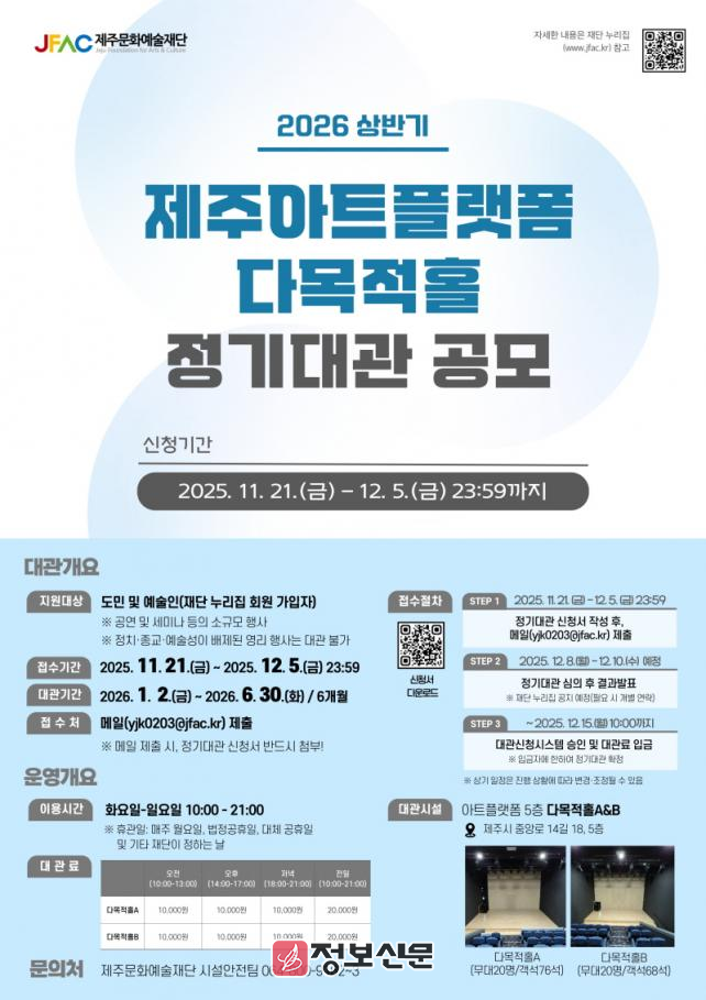 ![]() 제주문화예술재단, 2026년도 제주아트플랫폼 다목적홀 상반기 정기대관 접수 실시 |