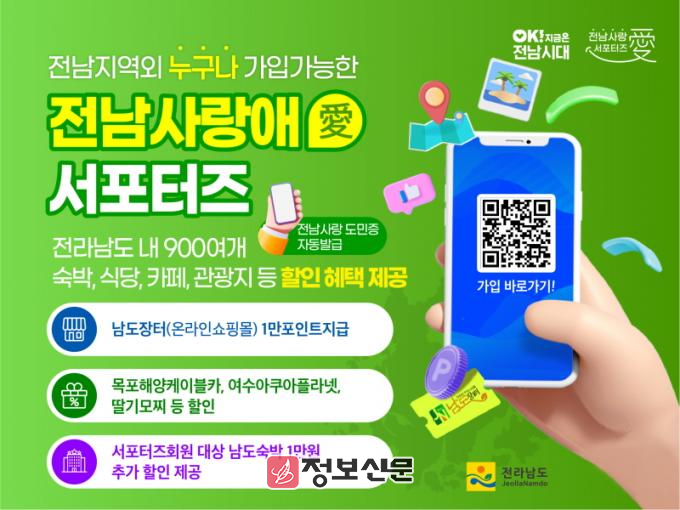 앞으로도 다양한 민간플랫폼과의 협력사업을 통해 전남 사랑애 서포터즈 100만 명 조기 달성을 위한 전략적 홍보를 이어갈 계획이다. 현재 전남 사랑애 서포터즈는 가입자가 62만 명을 넘어섰고, 관광·숙박·음식점 등 900여 할인가맹점 할인과 남도장터 쿠폰 제공, JN투어 숙박 할인 등 다양한 혜택을 제공하고 있다.