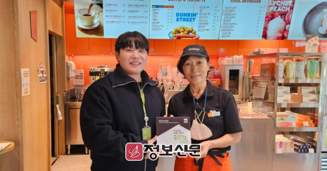 ![]() (사진 제공=굿네이버스 전북지부)굿네이버스 전북지부(지부장 김윤주)는 던킨도너츠 전주대점(대표 강지전)과 함께 ‘좋은이웃가게‘현판 전달식을 진행했다. 사진은 전달식을 진행한 모습. |