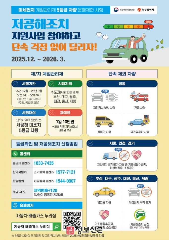 ![]() 광주광역시, 12월부터 배출가스 5등급 차량 운행제한 |