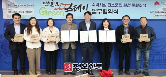 전주시와 (사)전주한옥마을숙박체험업협회, 전주지속가능발전협의회는 26일 시청 3층 회의실에서 숙박시설의 탄소중립 실천 문화 조성을 위한 협력체계를 구축하는 ‘전주올땐그린스테이 협약식’을 개최했다.
