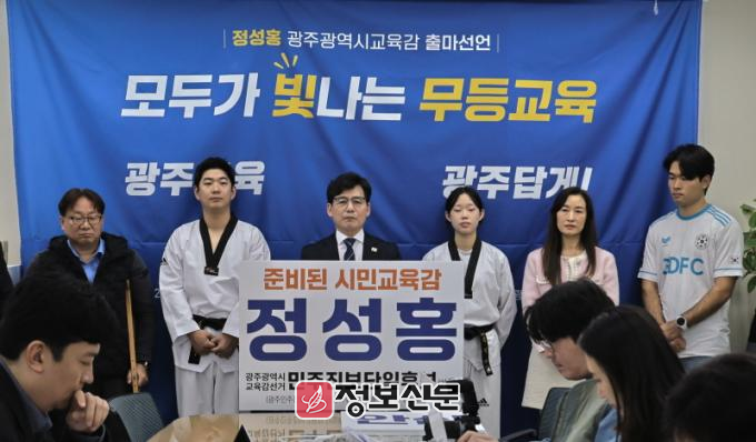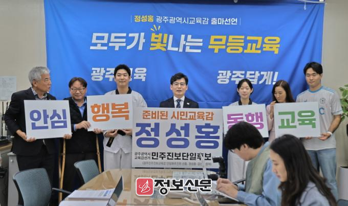 정 전 단일후보는“광주 정신의 뿌리는 교육에서 시작됐고, 광주는 교육의 힘으로 대한민국 민주주의의 흐름을 바꿔왔다”면서“그러나 평생 교단에 선 교육자로서 정성홍이 바라보는 현 이정선 교육감의 비리, 불통, 무능은 윤석열 정부의 실정(失政)과 닮아있어 아이들 얼굴 보기 부끄러운 지경”이라며 출마 이유를 밝혔다.