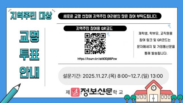 교명 선택을 위한 온라인 설문은 27일 오전 8시부터 내달 7일 오후 1시까지 본교 재학생과 보호자를 대상으로 진행되며 학생과 보호자, 교직원·동문·지역주민 등 다양한 주체가 온라인 설문 링크와 빠른응답코드를 통해 손쉽게 참여할 수 있다.