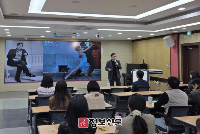 이날 연수에서는 세계적인 권위의 ‘카르만 펠로우십’에 국내 인문학자로 최초 선정되고 ‘인공지능 시대의 인간과 미래 교육’ 주제로 활발한 연구활동을 펼쳐온 동신대학교 김춘식 교수가 ”탱고, 몸의 언어와 공감행위를 통한 세대 소통과 회복탄력성“을 주제로 특강을 진행하였으며 “탱고는 상대를 이해하고 존중하는 마음으로 호흡을 맞춰야 비로소 완성되는 춤”이라며, 세대 간의 차이를 인정하고 조화를 이루는 소통의 중요성을 강조했다.