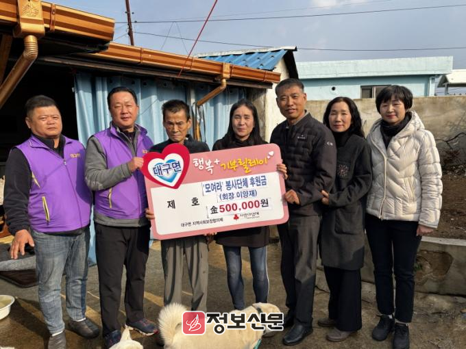 배대은 대구면장은 “지속적으로 지역 복지를 위해 힘써주시는 ‘모여라’ 봉사단체에 깊이 감사드린다”며, “대구면에서도 취약계층이 소외되지 않도록 다양한 지원 방안을 이어가겠다”고 전했다.