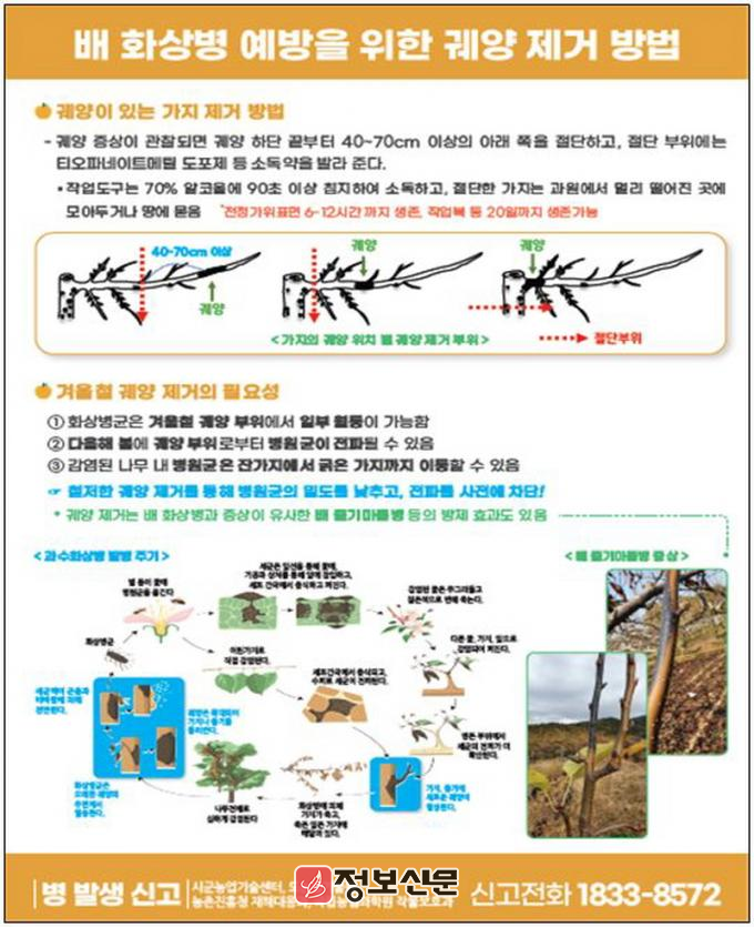 특히 동계 정지·전정 시 사용하는 가위·톱 등 작업도구와 장갑을 통한 전염 가능성이 큰 만큼, 작업 전·후 소독을 반드시 실시하고 절단면에는 방제약제를 도포해 추가 감염을 예방해야 한다.