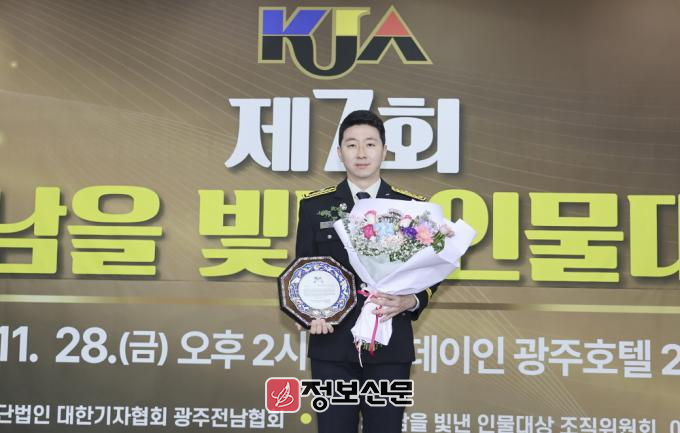 ![]() ▲ 11월 28일 광주 서구 홀리데이 인 광주호텔 2층 연회장에서 열린 ‘2025년 제7회 호남을 빛낸 인물대상’ 시상식에서, 사회부문 ‘모범소방’대상을 수상한 이재웅 해남소방서 땅끝119안전센터 소방위 |