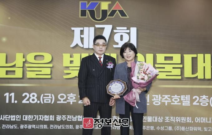 ![]() ▲ 11월 28일 광주 홀리데이 인 광주호텔 2층 연회장에서 열린 ‘2025년 제7회 호남을 빛낸 인물대상’ 시상식에서, (사진 오른쪽) 이순형 동신대학교 전기공학과 교수를 대신해 사모님이 사회부문 ‘사회공헌’대상을 수상한 뒤 기념촬영을 하고 있다. |