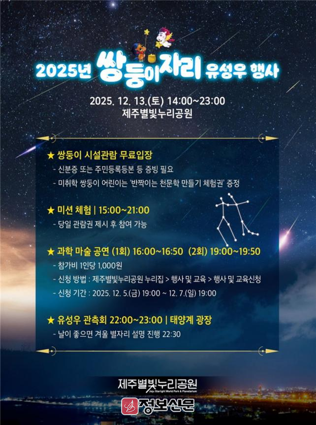 ![]() 제주별빛누리공원, 2025쌍둥이 유성우 관측 행사 개최 |