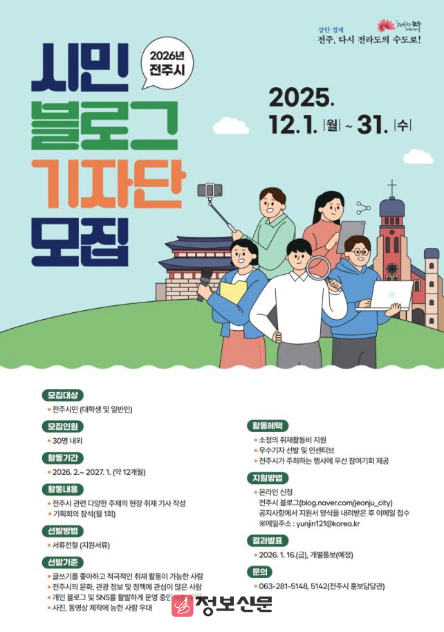 활동기간은 내년 2월부터 오는 2027년 1월까지 1년 동안이며, 전주시 블로그(blog.naver.com/jeonju_city)에서 내려받은 지원서를 작성해 전자우편(yunjin121@korea.kr)으로 접수하면 된다. 기타 자세한 사항은 전주시 블로그의 공지 사항을 확인하거나, 전화(063-281-5148, 5142)로 문의하면 된다.