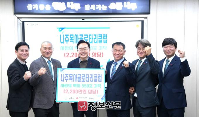 지난달 27일 시청 소회의실에서 열린 기탁식에는 윤병태 나주시장과 나주목사골 로타리클럽 김선태 회장 등 관계자들이 참석했다.