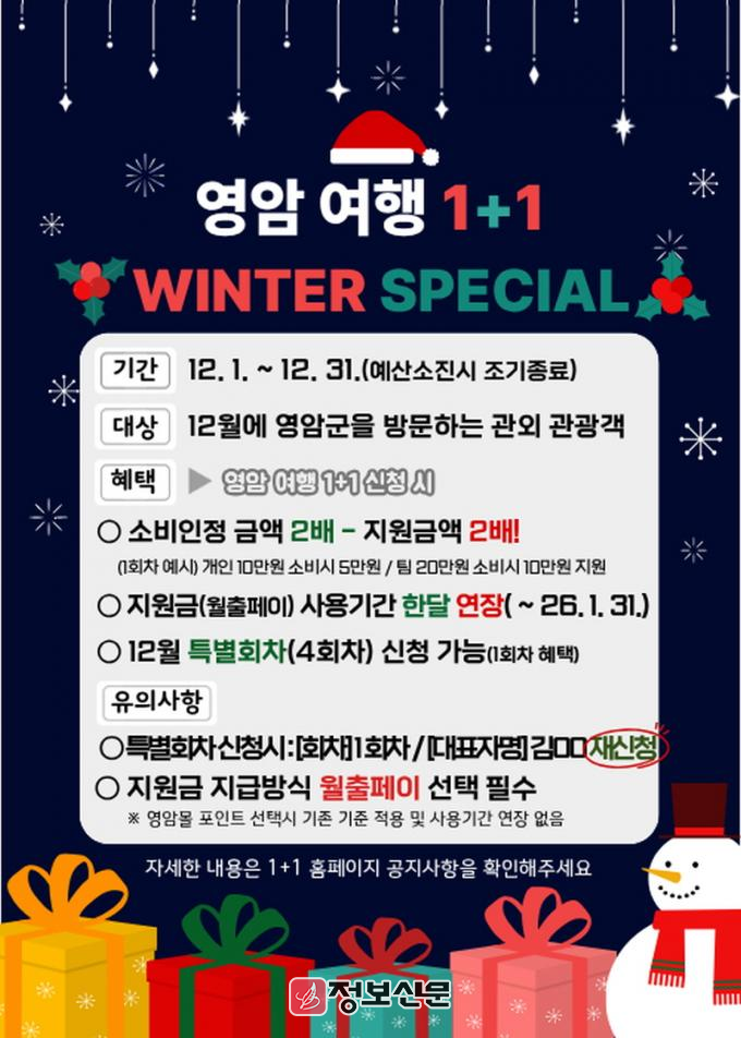 우승희 영암군수는 “눈 내린 월출산국립공원과 영산강, 구림마을 한옥 등 겨울 풍경이 아름다운 영암에서 가족·연인·친구와 함께 따뜻한 여행을 즐기고, 영암여행 1+1의 혜택도 두배로 누려보길 바란다”고 말했다.