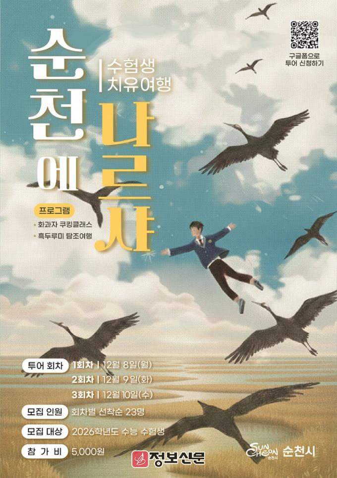 순천시 관계자는 “수능을 마친 청소년들이 잠시 멈춰 숨을 고르고, 자연 속에서 회복의 시간을 갖길 바란다”며, “행운의 새로 불리는 흑두루미와의 만남이 새로운 일상과 미래에 따뜻한 응원과 행운으로 이어지길 바란다”고 말했다.
