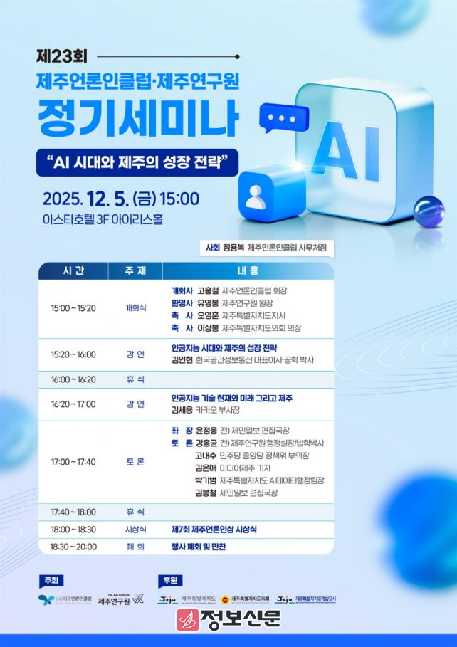 이후 윤정웅 전 제민일보 편집국장이 좌장을 맡아 심도 있는 토론을 진행한다. 토론에는 강홍균 전 제주연구원 행정실장, 고내수 민주당 중앙당 정책위 부의장, 김은애 미디어제주 기자, 박기범 제주특별자치도 AI데이터행정팀장, 김봉철 제민일보 편집국장이 참여해 AI 시대에 필요한 제주의 정책 방향, 지역 산업과 일자리 변화, 언론의 역할 등 폭넓은 의견을 제시할 예정이다.