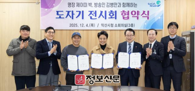 익산시는 4일 시청 소회의실에서 무형문화유산 도자기 명장 제이미 박, 그리고 그의 제자인 방송인 김병만과 도자기 전시회 개최를 위한 협약을 체결했다. 협약식에는 정헌율 익산시장과 제이미 박, 김병만이 참석했다.
