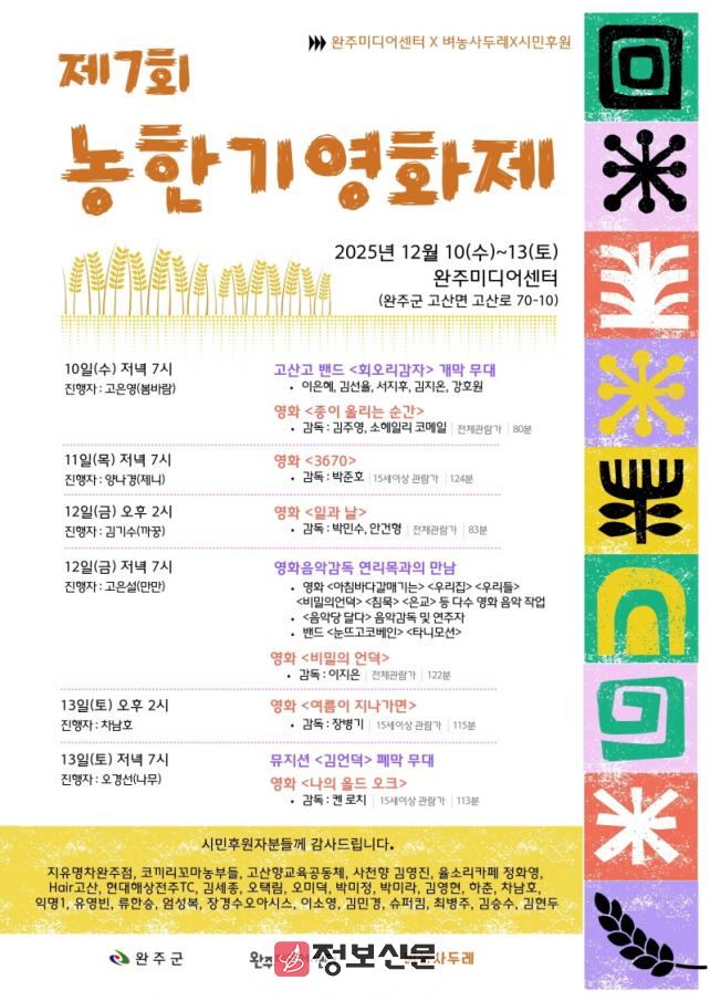 농한기영화제는 주민공동체 고산권벼농사두레(이하 벼두레)와 완주미디어센터가 매년 협업해 진행해 온 지역 영화축제로, 올해는 주민들의 자발적 후원이 더해져 한층 풍성한 프로그램을 선보인다.
