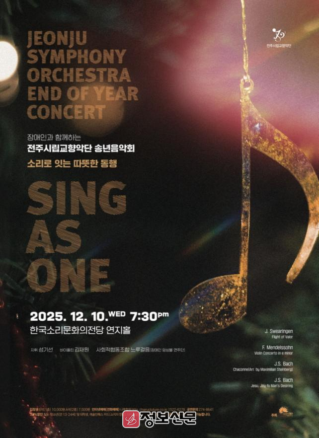 노은영 전주시 문화체육관광국장은 “이번 공연은 연말 감성을 담은 음악 속에서 사회적 포용의 가치를 공유하는 뜻깊은 무대가 될 것”이라며 “시민들이 함께 참여해 예술이 전하는 따뜻한 메시지를 나누길 바란다”고 말했다.