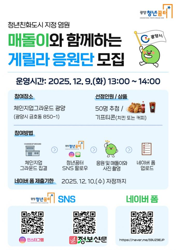 ![]() 광양시, 청년친화도시 염원 ‘매돌이 응원단’ 모집 |