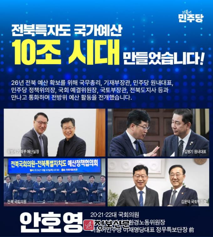 ![]() 안호영 국회의원, ‘전북 예산 10조 원 시대’ 개막 직접 뛰어 이뤄낸 성과 |