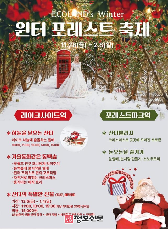 이번 이벤트는 에코랜드의 레이크사이드역과 포레스트파크역에서 진행되며, 동백나무 트리 스페이스에서 펼쳐지는 산타 & 윈터 동백숲 요정들과의 포토 타임, 에코랜드 스카이바이크를 활용한 ‘날으는 산타’ 퍼포먼스 등 다채로운 겨울 프로그램으로 꾸며진다.