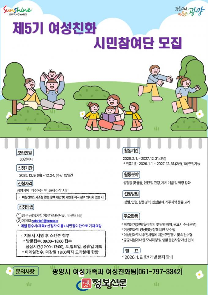 ![]() 광양시, 제5기 여성친화 시민참여단 모집 |
