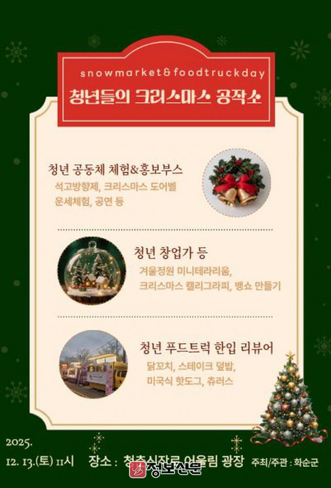 조미화 인구청년정책과장은 "서로 다른 분야에서 활동하는 청년들이 교류하고, 군민들과 함께 연말의 따뜻한 추억을 쌓을 수 있는 자리"라며, “많은 분이 방문해 청년들의 열정을 응원해 주시길 바란다”라고 전했다.
