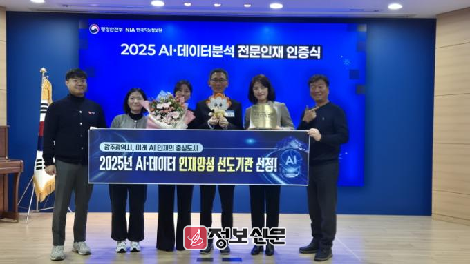 광주광역시(시장 강기정)는 10일 서울 유진인재개발원에서 열린 행정안전부 주관 ‘데이터분석 전문인재 인증서 수여식’에서 ‘AI·데이터 분석 인재양성 선도기관’으로 선정돼 인증패를 받았다. 이는 광주시가 추진해 온 데이터 기반 행정 고도화 노력이 공식적으로 인정받은 성과다.
