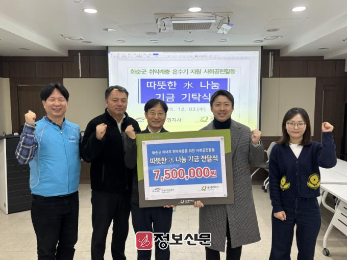 ‘따듯한 수(水) 나눔’은 능주면, 도암면, 동복면, 백아면, 사평면, 청풍면, 춘양면, 한천면, 화순읍에 거주하는 에너지 취약계층 20가구에 온수기를 설치하여 겨울철에도 따뜻한 물을 사용할 수 있는 생활환경을 조성하고 궁극적으로 대상 가구의 위생과 건강, 삶의 질을 향상을 도모하였다.