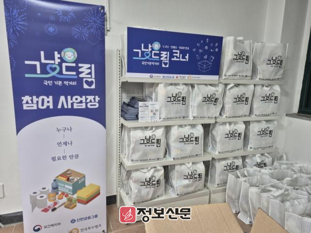 ‘먹거리 기본보장 코너’는 보건복지부에서 생계가 어려운 국민을 선제적으로 보호하기 위해 마련된 사업으로, 생계가 어려운 국민이 방문하면 1인당 3~5개의 먹거리와 생필품(약 2만원 상당)을 지원한다.