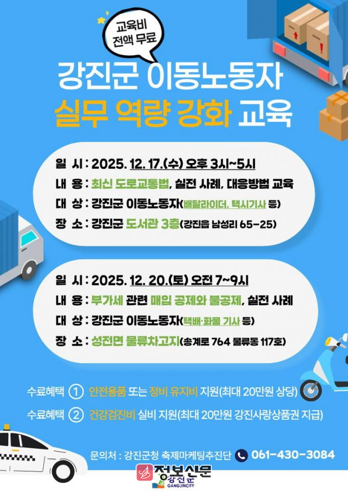 이동노동자란 배달라이더, 택시·대리기사, 택배·화물 종사자 등 일정한 작업장이 없는 상태에서 주로 이동하며 일하는 노동자를 말하며, 근로 환경과 법적 보호에 있어 사각지대에 놓이는 경우가 많다. 이에 따라 강진군은 이번 교육을 통해 노동자의 안전, 건강관리, 직무 역량 향상 등 실질적인 도움이 될 수 있도록 교육을 제공할 예정이다.