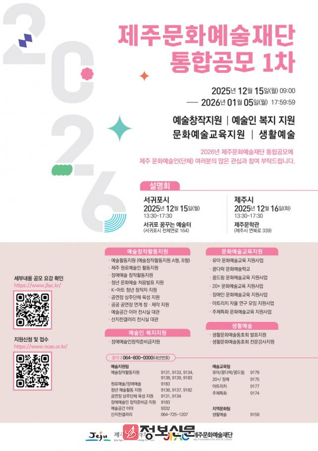 ![]() 제주문화예술재단, 2026년 지원사업 1차 통합공모 실시 |