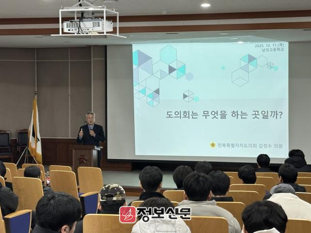 ![]() 전북도의회 김정수 의원, 남성고 특강 ‘청소년의 작은 참여가 전북의 미래를 바꾼다’ |