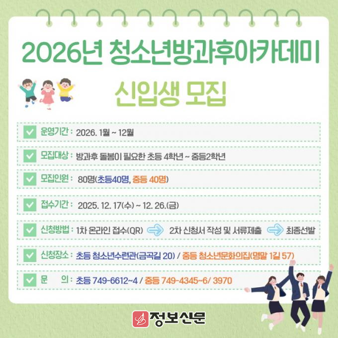 ![]() 순천시, 2026 청소년방과후아카데미 신입생 모집 |