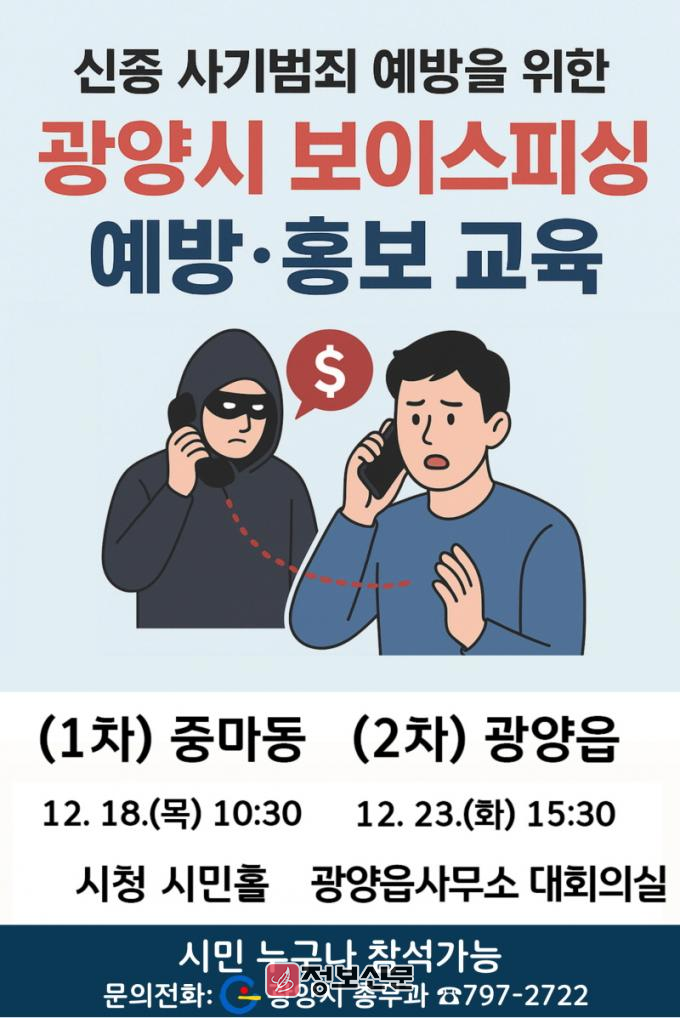 시 관계자는 “보이스피싱은 누구나 피해자가 될 수 있는 만큼 시민들의 경각심과 대응 능력 향상이 무엇보다 중요하다”며 “어르신 등 디지털 금융 취약계층은 물론, 소상공인과 기업인 등 다양한 시민들이 이번 교육을 통해 스스로를 지킬 수 있는 실질적인 예방 역량을 갖추는 계기가 되길 바란다”고 말했다.