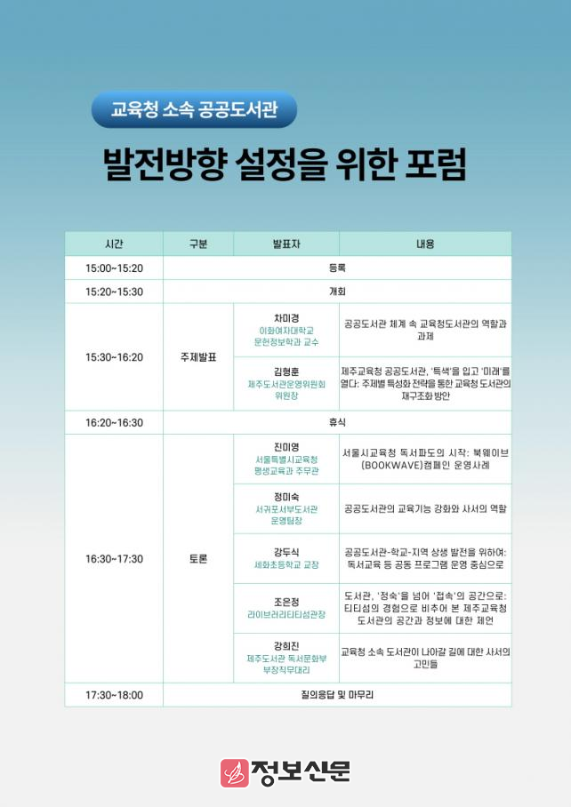 제주도서관 관계자는 “이번 포럼은 교육청 소속 공공도서관의 기능과 역할을 점검하고 강점과 개선 과제를 도출하는 뜻깊은 자리가 될 것으로 기대한다”고 말했다.