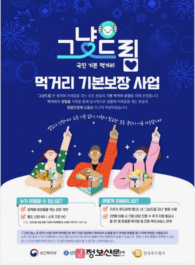 15일 익산시에 따르면 정부가 새로 도입하는 '그냥드림' 사업은 갑작스러운 생계 위기나 질병, 실직 등으로 식료품 지원이 필요한 시민에게 즉시 식료품을 제공하는 국가 차원의 복지 보장 정책이다. 지원 절차를 간소화해 접근성을 높인 것이 특징이다.