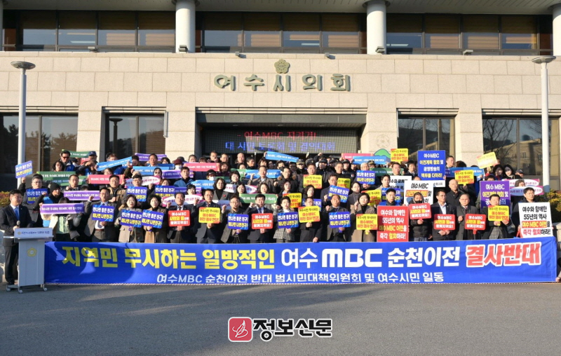 15일 여수시에 따르면, 이날 오후 3시 여수시와 여수시의회, 시민사회단체로 구성된 ‘여수MBC 순천이전 반대 범시민대책위원회(이하 범대위)’는 시의회 청사 1층 공감뜨락에서 ‘여수MBC 지키기! 대시민 토론회 및 결의대회’를 가졌다.