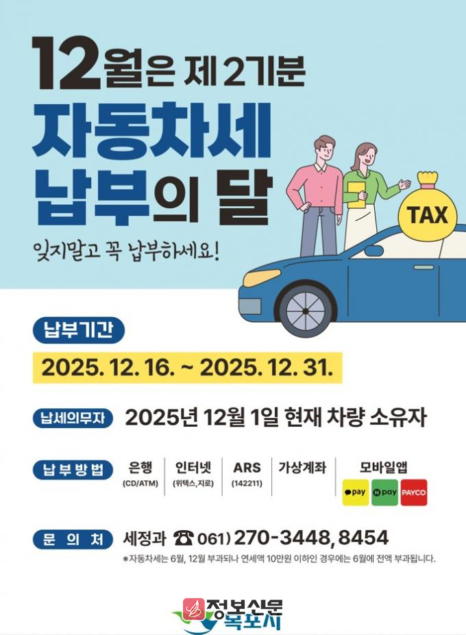![]() 목포시, ‘12월 정기분 자동차세’ 납부하세요 |