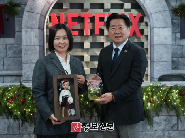 오영훈 제주도지사는 이날 넷플릭스서비시스 코리아에서 김민영 VP에게 명예도민증을 전달하며 그동안의 공로에 감사를 표했다.